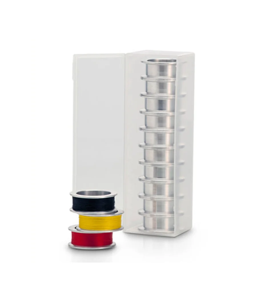 Many fly tiers using a variety of working threads find it economical to change spools rather than have a separate bobbin for each thread. Our spools hold from 50 to 500 yards of thread, depending on the size (diameter), and it’s best not to overfill them.